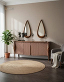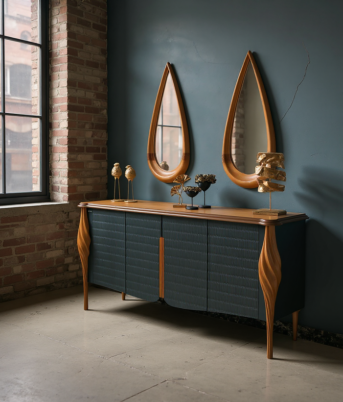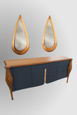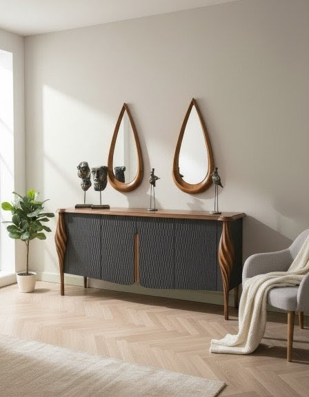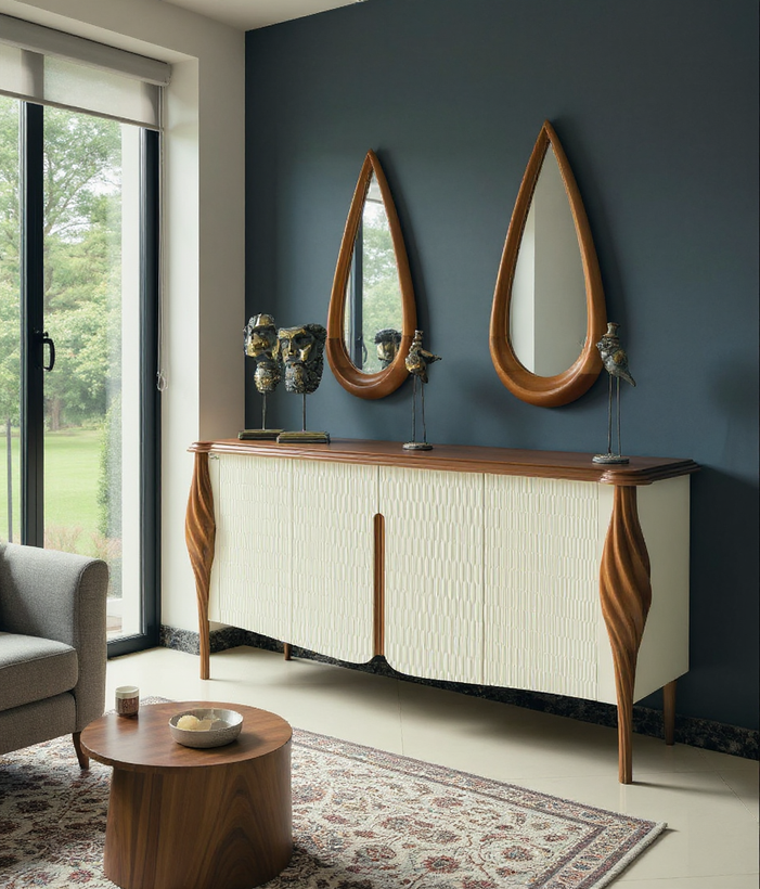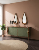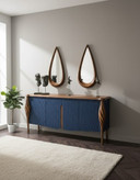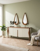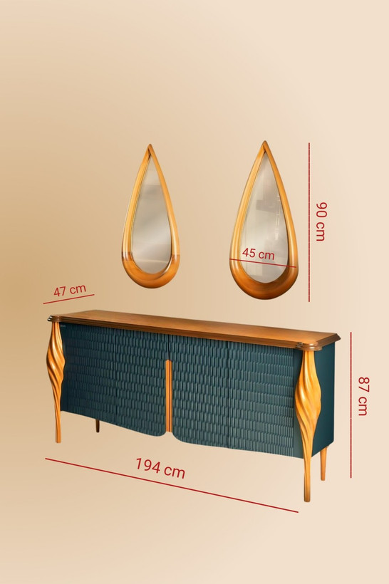 آینه کنسول ویکتوریا با ابعاد ۱۹۴ سانتیمتر طول، ۸۷ سانتیمتر ارتفاع و ۴۷ سانتیمتر عمق، فضایی چشمنواز و کاربردی در اتاق پذیرایی یا ورودی خانه ایجاد میکند. آینههای تزئینی با قاب چوبی به شکل قطرهای (هر کدام با ارتفاع ۹۰ سانتیمتر و عرض ۴۵ سانتیمتر) به صورت دوتایی طراحی شدهاند که جلوهای لوکس و متمایز به این مجموعه میبخشد. رنگبندی گرم چوب راش در قاب آینه و پایهها در کنار بدنه مشکی با بافت خاص، تعادلی جذاب بین مدرنیته و سنت ایجاد کرده است.
