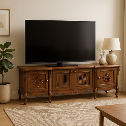 میز تلویزیون مدل کمل دو نوع حصیری و ساده ، روکش بلوط و پایه چوبی